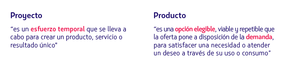 Basándonos en estas definiciones, podemos decir que proyecto está considerado dentro de producto y por tanto, se complementan. Pero, hay un importante matiz entre los dos, pues el proyecto es temporal y un producto está vivo, perdura en el tiempo y esto ocurrirá mientras exista una relación de aporte de valor entre cliente, producto y organización.