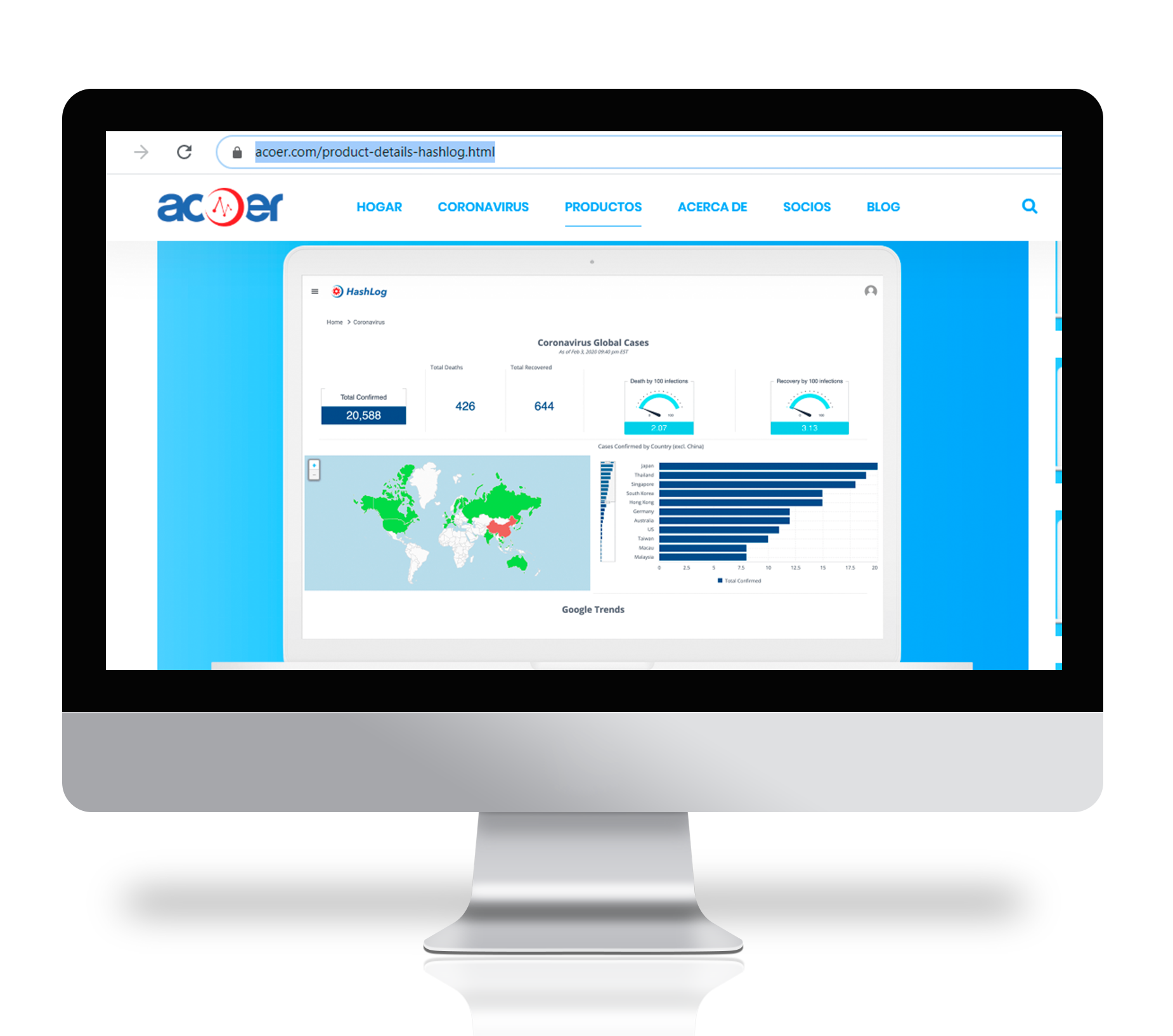 Más recientemente el desarrollador de aplicaciones habilitadas por Blockchain, Acoer creó HashLog para la visualizar en tiempo real los datos y tendencias de expansión del virus. Como la recolección de datos es automatizada, médicos, investigadores y especialistas pueden ver en tableros dinámicos la evolución de la epidemia, el número total de contagiados, las tasas de mortalidad y la cantidad de recuperados, tanto a nivel global como por cada país.