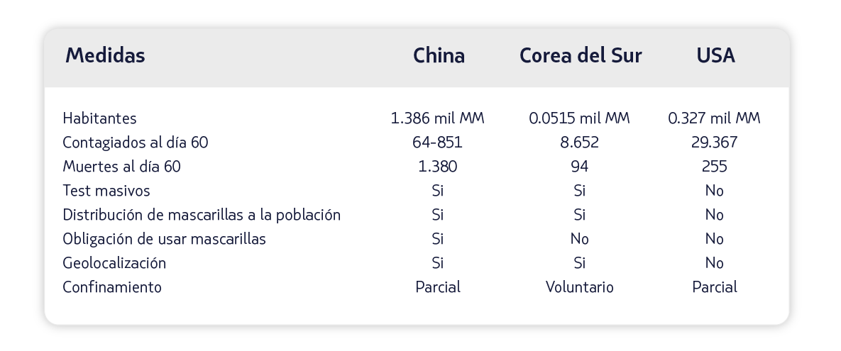 En la siguiente tabla podemos comparar la situación de Corea del Sur, China y Estados Unidos. En ese último país se muestra un claro ejemplo de los efectos de indisciplina y medidas tardías, teniendo en porcentaje del total de la población varias veces más alto que los casos reportados por China, sólo comparando los primeros 60 días. Hoy se puede ver que EEUU representa casi un 27% del total de casos a nivel mundial (Tabla 1).