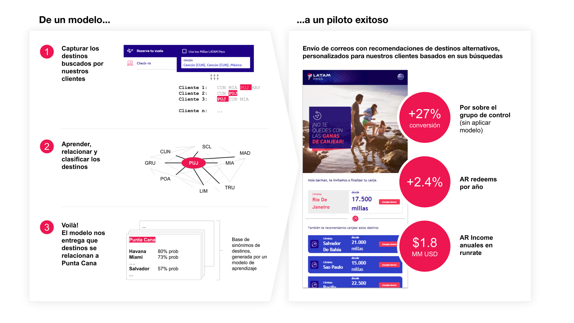 Con Operaciones estamos trabajado para predecir algunos atrasos, permitiéndonos adelantar esos escenarios para tratar de solucionarlos. Asimismo, tenemos aplicaciones en LATAM Pass para entender mejor a nuestros clientes, como recomendaciones de destinos de canje o de productos como las tarjetas de cobrand, de manera que podamos hacer ofertas más personalizadas.