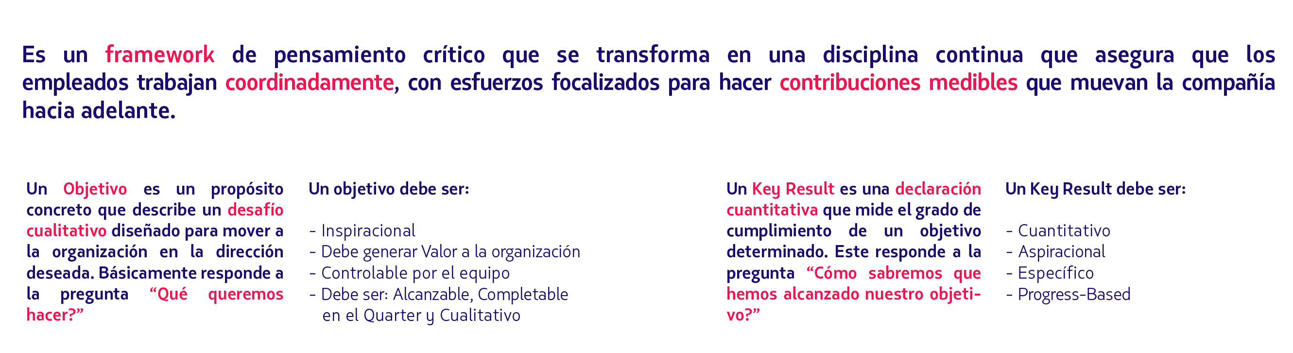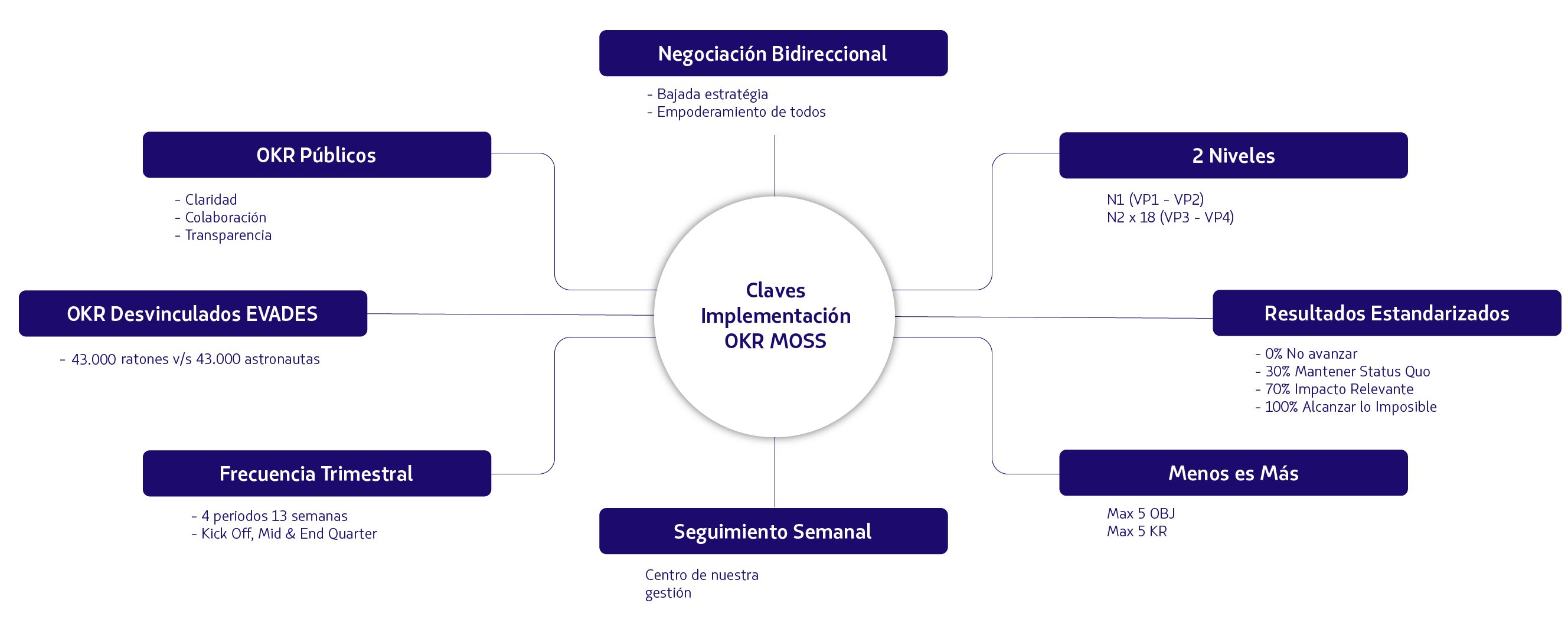 Las principales claves del modelo que diseñamos fueron: Limitar a dos niveles los OKR de toda la Dirección, fomentar un diálogo bidireccional, definir una cadencia trimestral con valores estándar para los posibles resultados, estimular el seguimiento semanal y asegurar que la información de los OKR y sus resultados fuera pública.