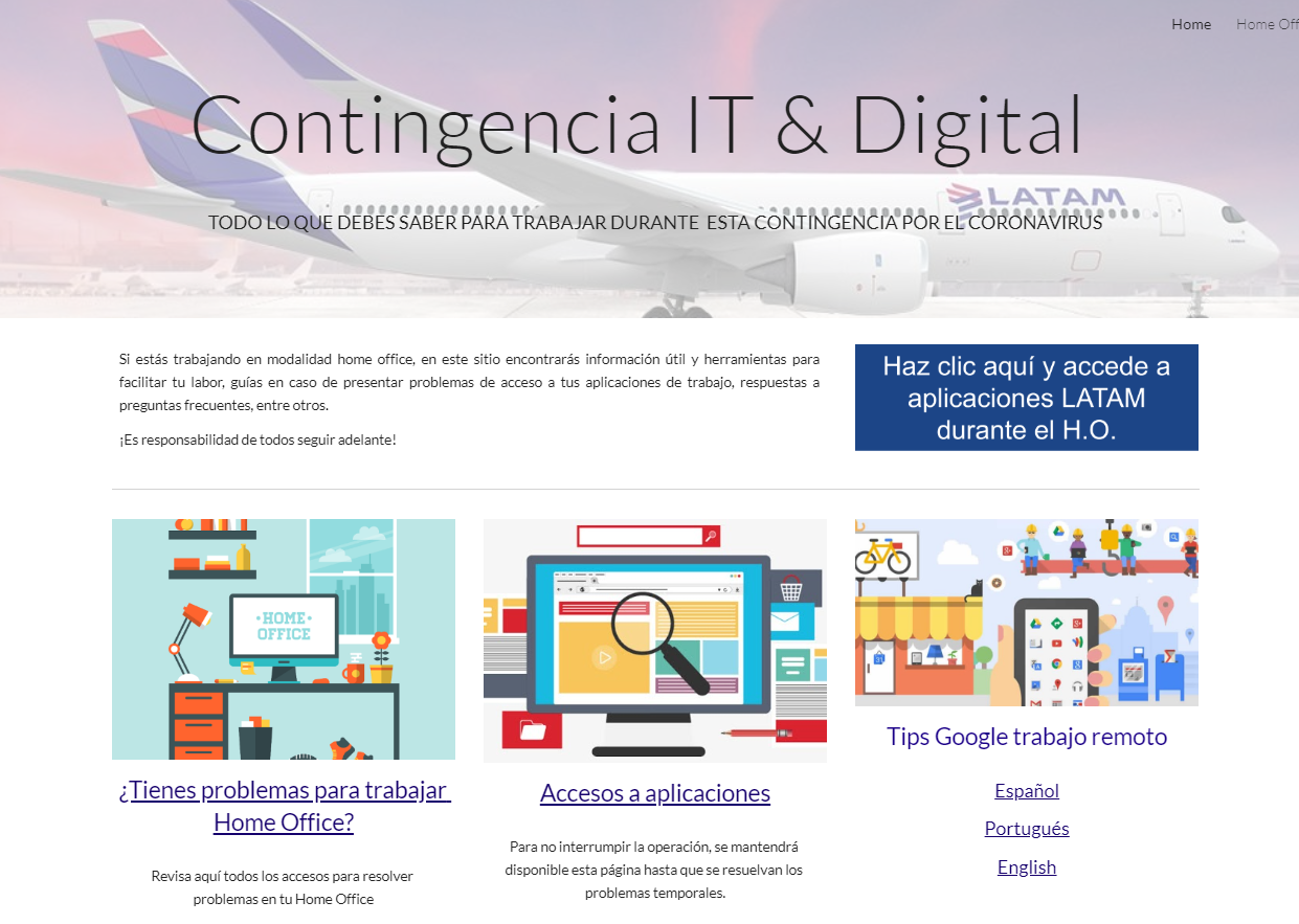 Frente al avance que ha tenido el Coronavirus en nuestro país y la implementación de diversas medidas para el cuidado de la salud que ayuden a evitar su contagio, a partir de esta semana en LATAM nos sumamos a trabajar bajo la modalidad Home Office (HO).