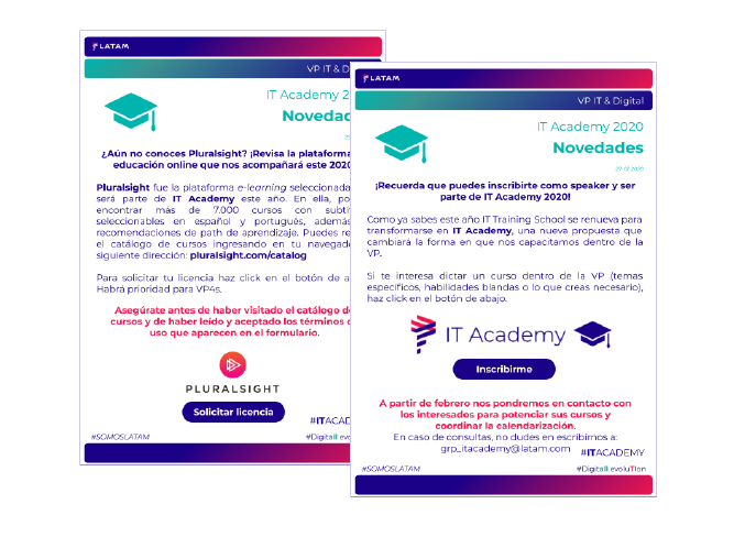 Desde nuestra Vicepresidencia IT & Digital se apoya constantemente el desarrollo laboral de los profesionales IT, entregando capacitación para que puedan actualizar sus conocimientos, fortalecer sus competencias y prepararse para abordar los desafíos del proceso de Transformación Digital en LATAM.