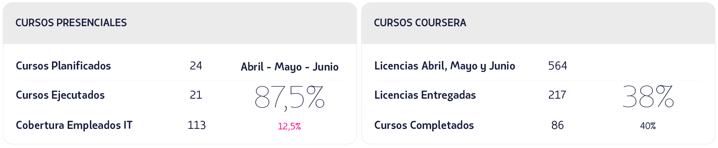 Como resultado del primer trimestre abril-junio, logramos una cobertura de un 15% del total de empleados, que asistieron a 21 cursos presenciales y asignamos 217 licencias Coursera, para capacitarse vía e-learning.