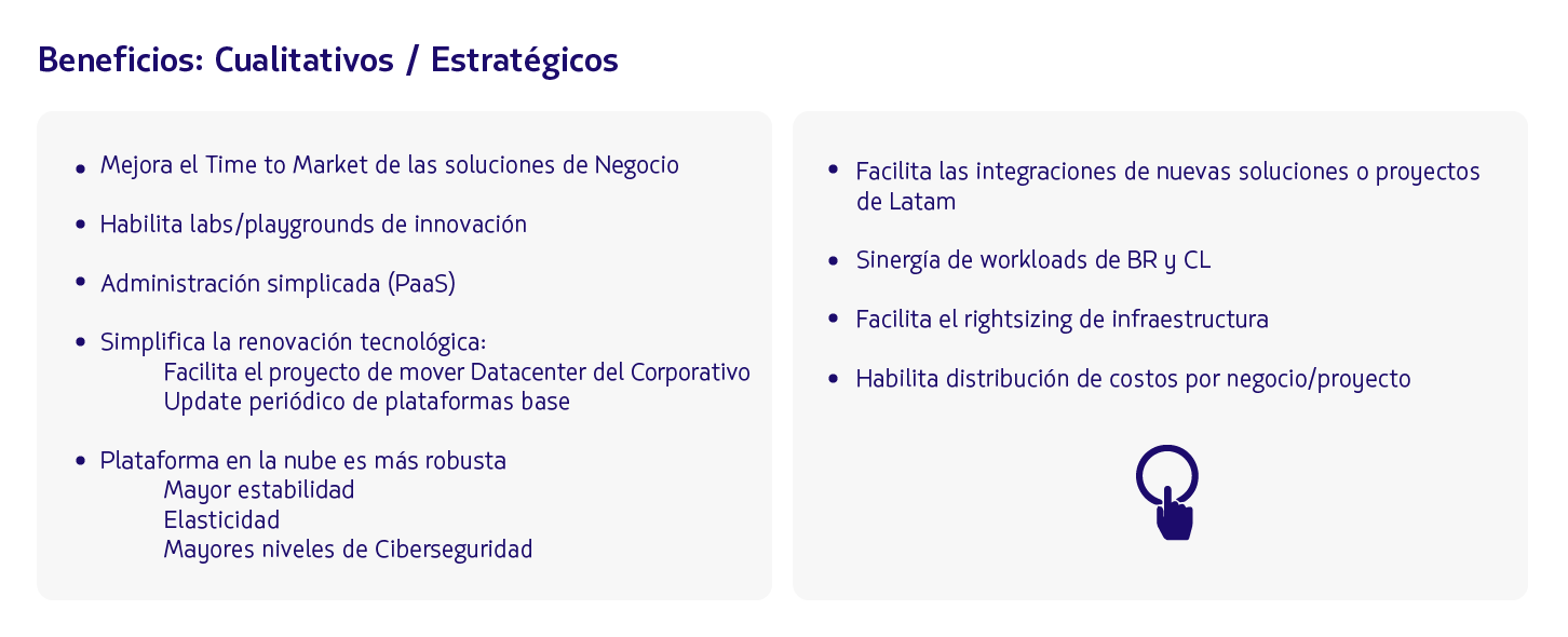 Uno de los grandes beneficios es que podremos otorgar un mejor servicio y experiencia a nuestros clientes internos y externos, al contar con plataformas más estables, más rápidas en temporadas de peaks y más flexibles.