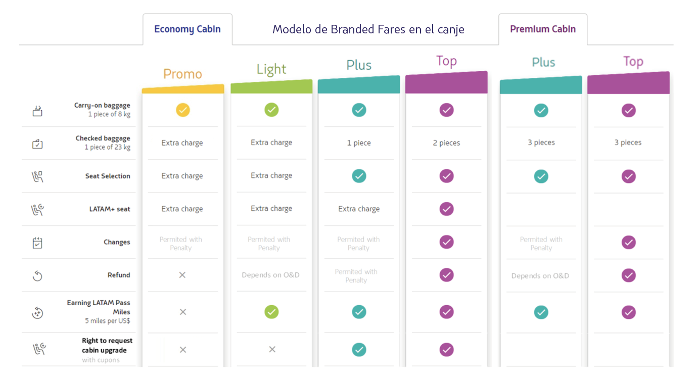 También, en LATAM Pass y Multiplus comenzaremos a vender las tarifas asociadas a los Branded Fares, dejando el actual modelo de las Families Fares. Con esto, podremos ofrecer e incrementar fuertemente la venta de los ancillaries asientos y maletas.