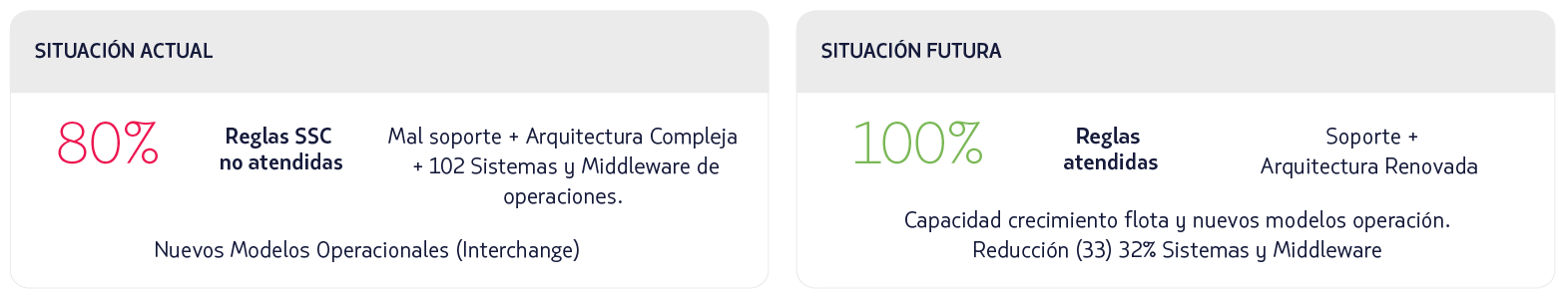 Uno de sus impactos será en el negocio, en donde era necesario disminuir el riesgo operacional. Había un 80% de reglas no atendidas sobre el control de la operación y de la tripulación en los SSC, cuya gestión y control era manual. El efecto se daba principalmente en el OTP (On Time Performance), por ejemplo si se generaba un retraso en el despegue de nuestros aviones, y por ende, después en el NPS.