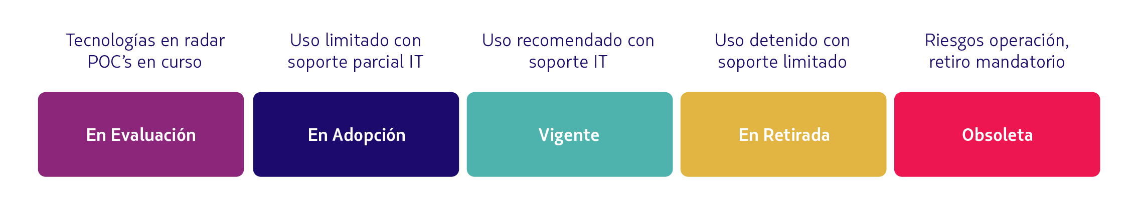 Cuando aplicamos el proceso de Roadmap Tecnológico, también nos hacemos cargo del ciclo de vida de la tecnología, que va desde la adopción hasta el retiro.