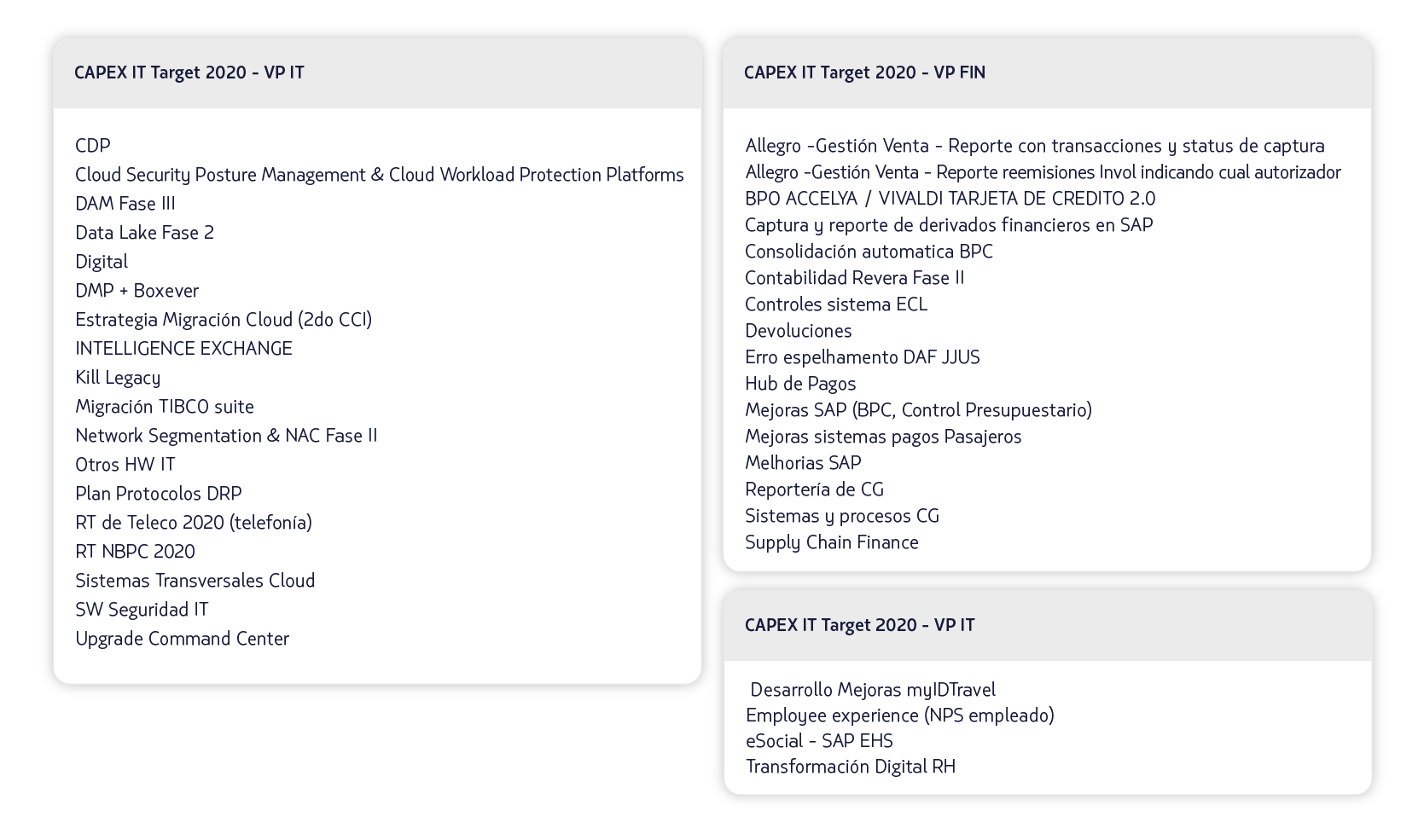 - En base a los proyectos committed, se define que este año el target de inversión NO se debe exceder la inversión de proyectos a más de USD $152 MM en CAPEX IT 2020