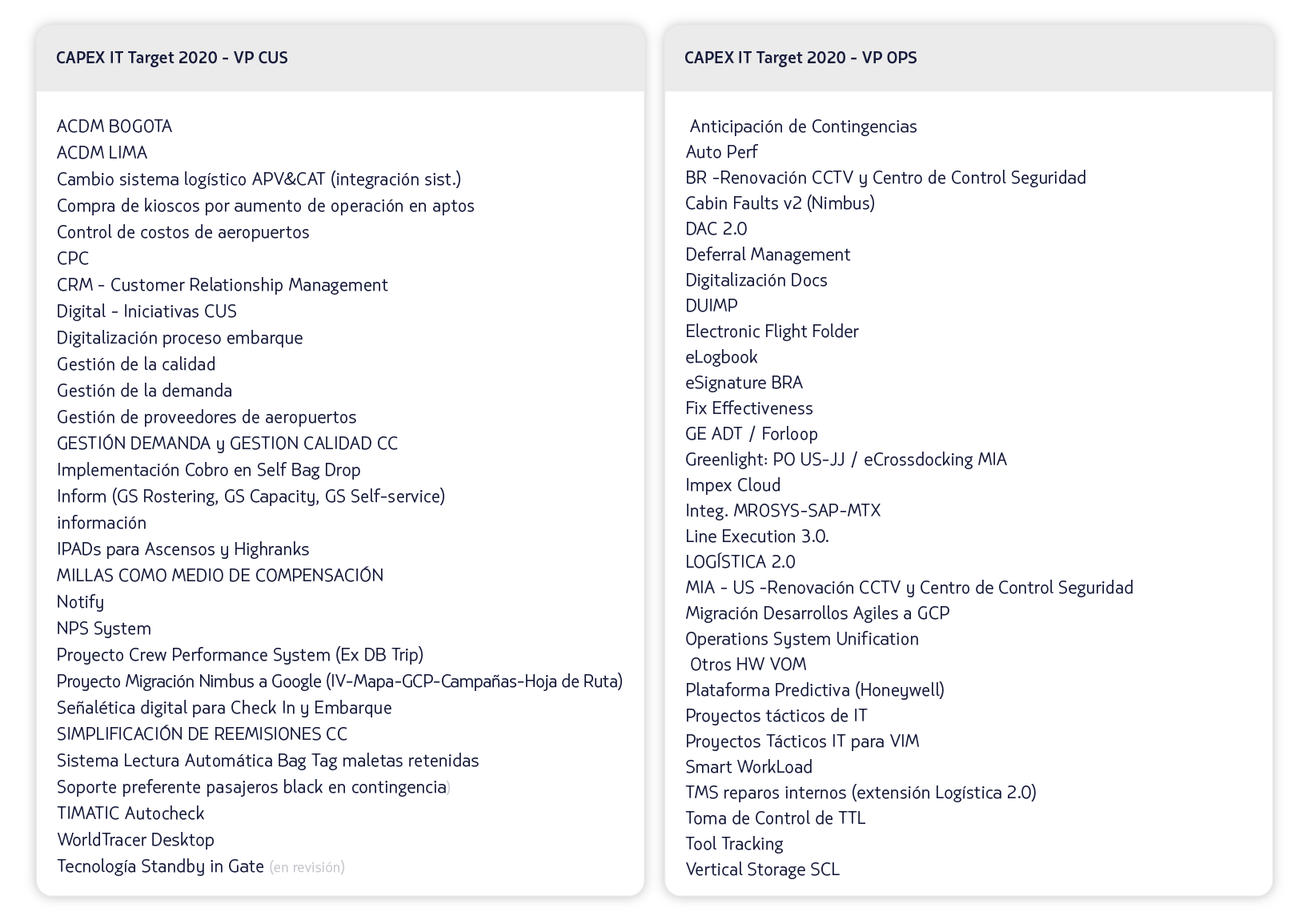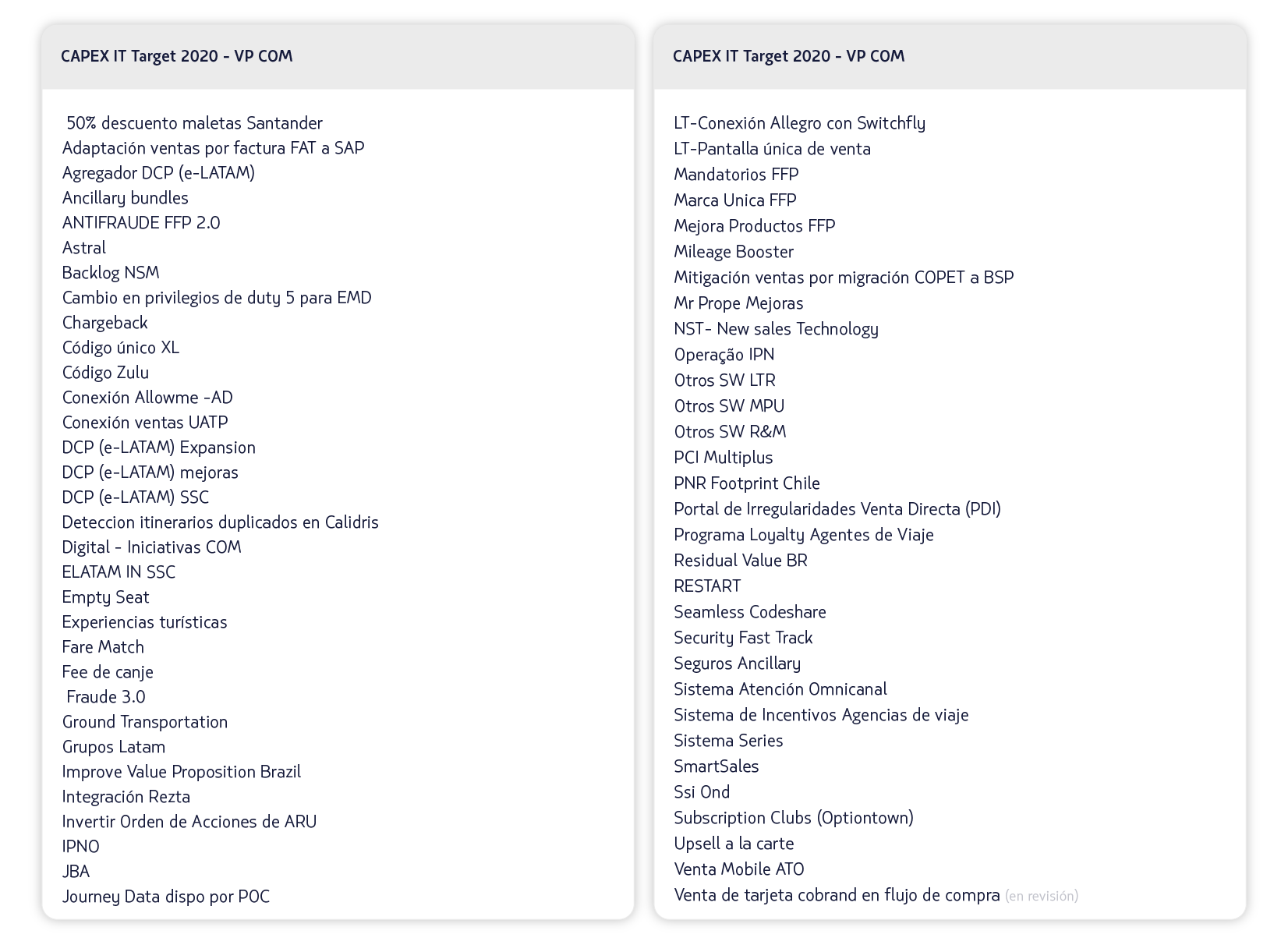 Agradecemos a todos su participación y alineamiento con las prioridades de LATAM para cumplir las iniciativas que maximizan la entrega de valor a nuestros clientes. A continuación se encuentra las iniciativas en el CAPEX que quedaron como Committed:
