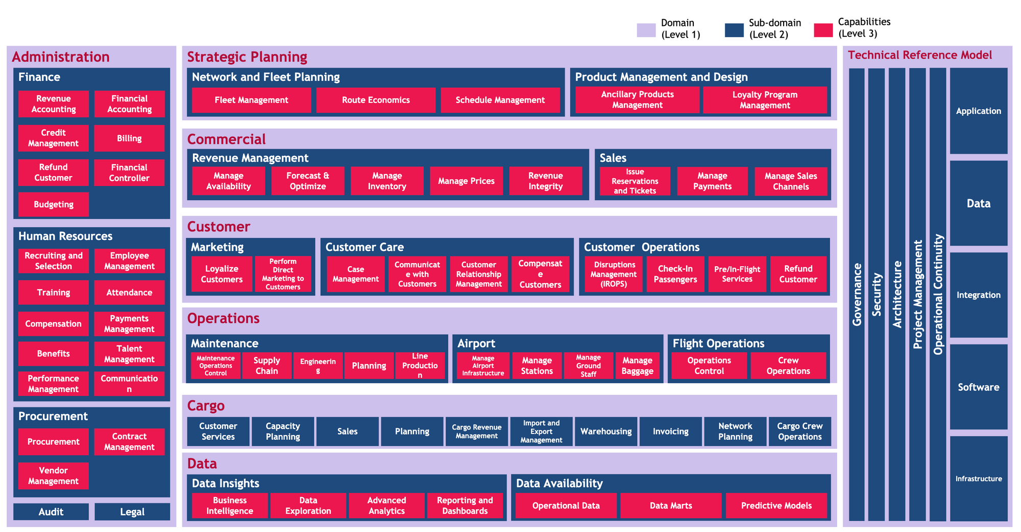 Hemos detectado siete dominios de negocio dentro de la compañía, que son: Administración, Planificación Estratégica, Comercial, Cliente, Operación, Cargo y Data. Además, agregamos el Technical Reference Model (TRM), que se refiere a cuáles son las capacidades técnicas que tiene LATAM para hacer que las capacidad de negocio sea una realidad e indirectamente, muestra cuál es el trabajo de IT y cómo las tecnologías nos ayudan a lograr nuestros objetivos.