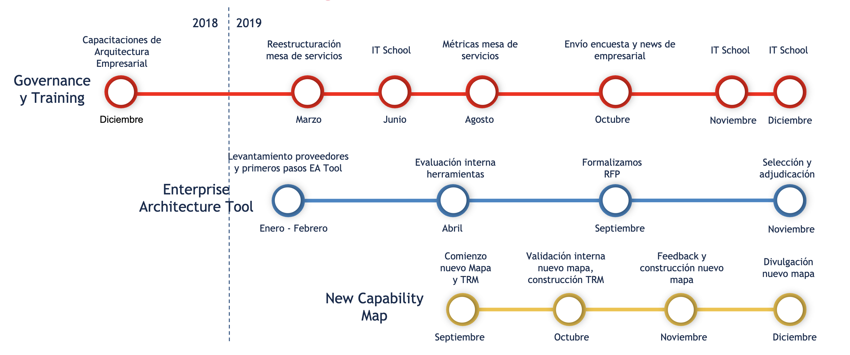 Este año comenzamos la segunda etapa de nuestro trabajo, en donde buscamos instaurar la práctica de arquitectura empresarial en todas las etapas del proceso agregando una capa de Governance que permita generar indicadores, detectar oportunidades de mejora y alinear estratégicamente los proyectos.
